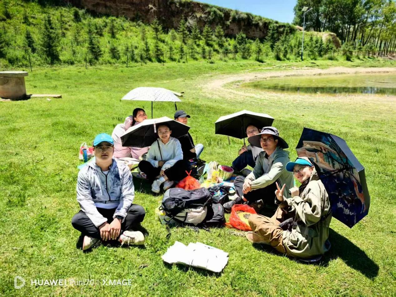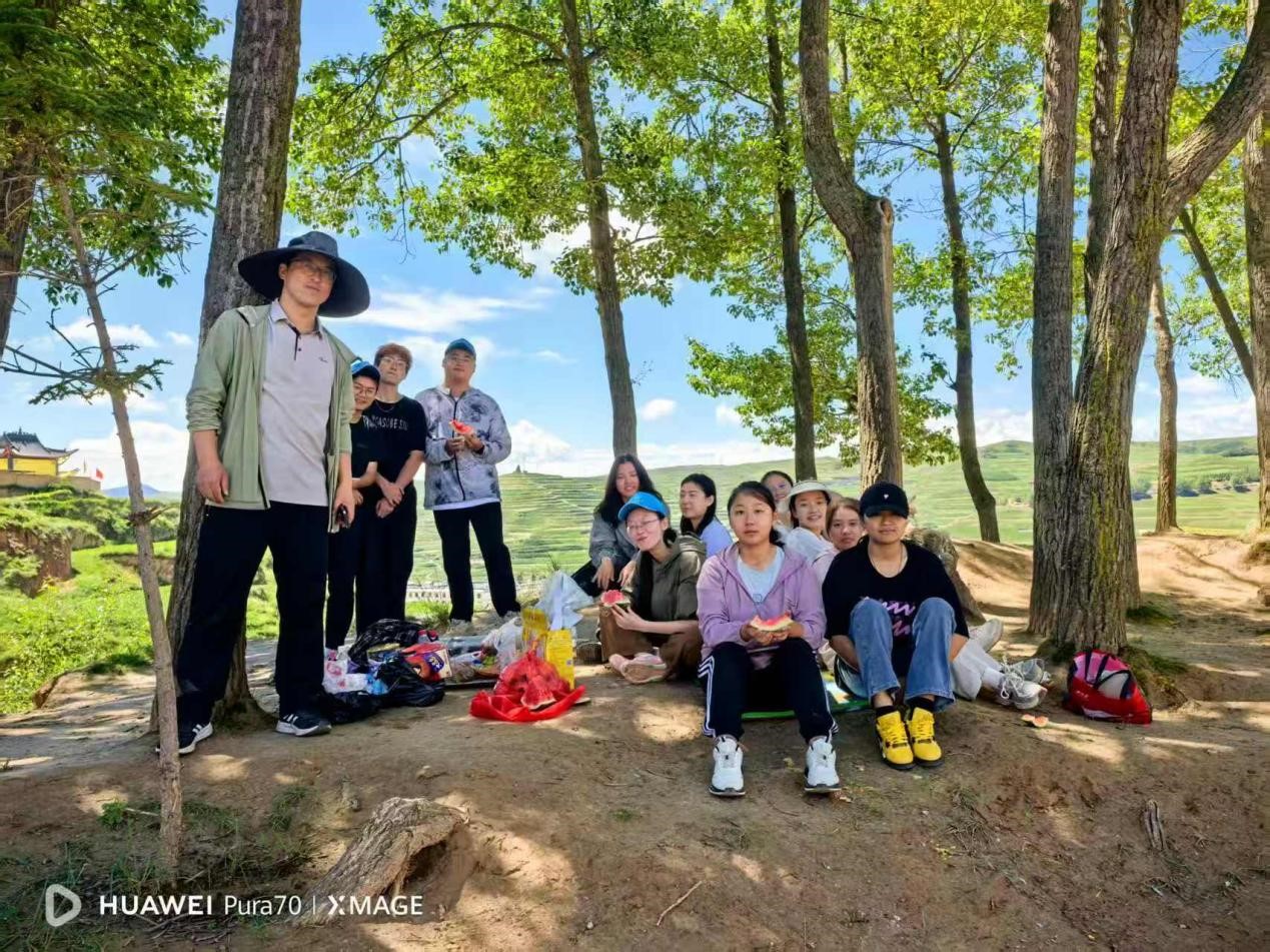 从城墙上下来,大家在草坡上铺开防潮垫,把零食、水果一股脑倒出来,围成一个热闹的圆圈。没有了访谈提纲的束缚,没有了记录笔记的紧张,同学们彻底放松下来:有人聊起在学校时熬夜赶论文的窘事,引得众人捧腹;有人分享这次田野中克服语言障碍的小技巧,收获一片赞同;还有人说起刚到新城时的拘谨,对比现在能和老乡熟练打招呼的从容,忍不住感慨“原来自己不知不觉成长了这么多”。阳光透过云层洒在每个人脸上,笑声顺着风飘向远方的山峦。从初见面时的客气疏离,到田野中分工协作时的默契配合,再到此刻围坐畅谈的自在熟稔,这段共同走过的时光,早已让同学们之间生出超越课堂的情谊。这场“浪山”之行,或许没有收集到学术资料,却让大家在自然与欢歌中读懂:田野调查的收获,从来不止于笔记本上的文字——那些并肩走过的路、一起笑过的瞬间、彼此扶持的成长,都是这段实习时光里最珍贵的注脚。